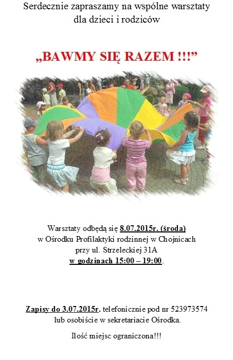 Warsztaty odbędą się 8.07.2015r. (środa) w Ośrodku Profilaktyki rodzinnej w Chojnicach przy ul. Strzeleckiej 31A w godzinach 15:00 – 19:00.